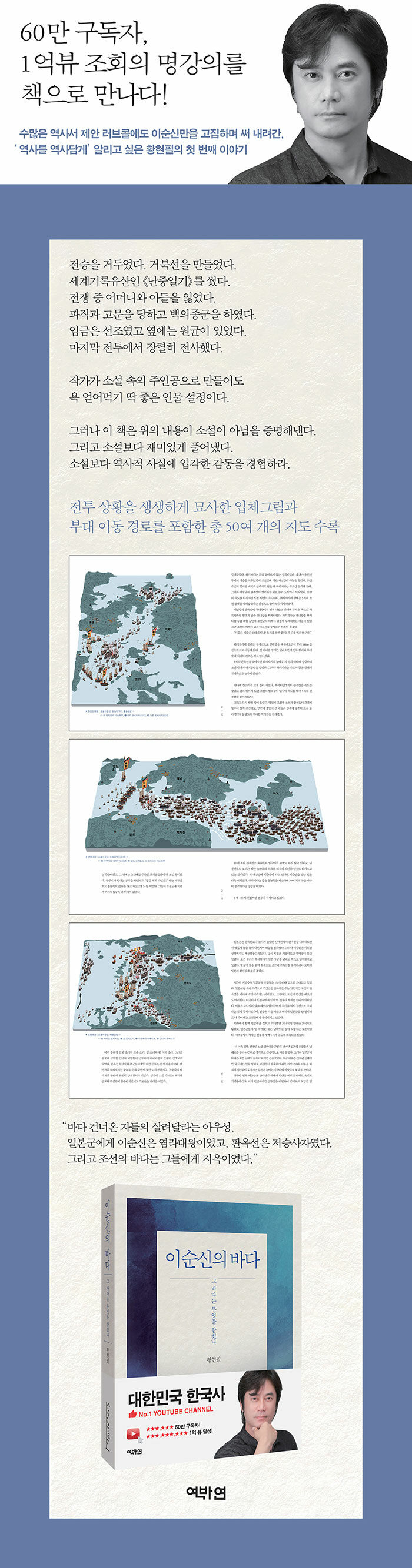 1억뷰 조회수를 기록한 황현필의 대표강의 임진왜란과 이순신에 대한 이야기. 이순신을 힘들게 했던 임금 선조와 빌런의 대명사 원균. 그리고 류성룡과 윤두수, 이원익, 그리고 권율과 곽재우 등 7년의 전쟁 중 얽히고설킨 이야기를 통해 당시의 인간상을 들여다볼 수 있다. 노량해전에서 전사한 이순신에 대한 자살설, 은둔설, 그리고 이에 대한 반박을 소개하며 후세에도 영웅으로 기억되는 이순신을 우리는 어떻게 바라보아야 하는지 저자는 말한다.