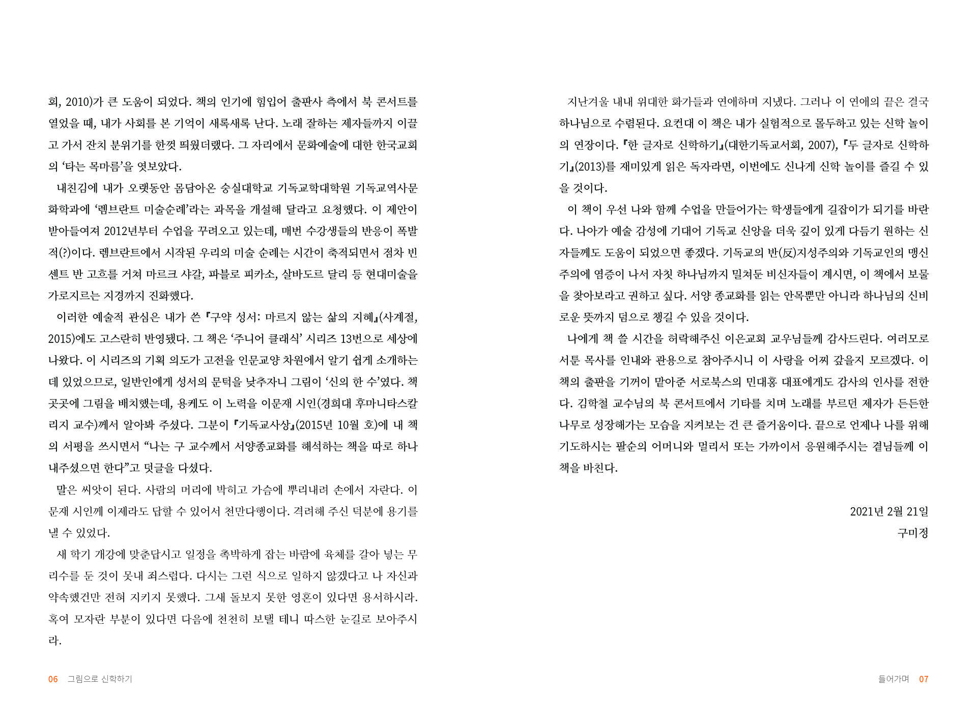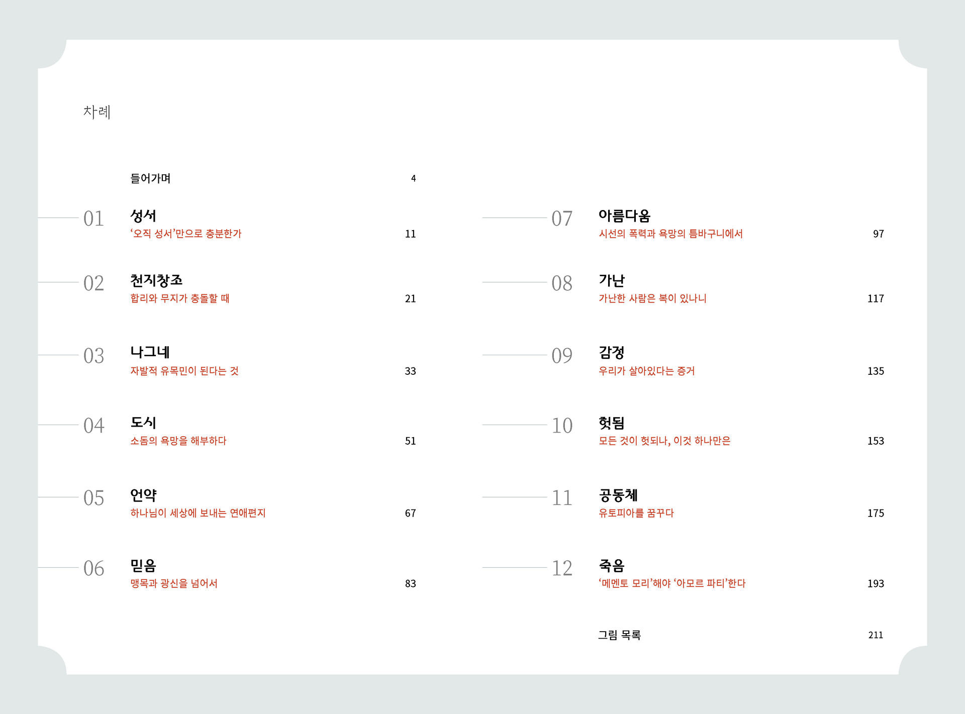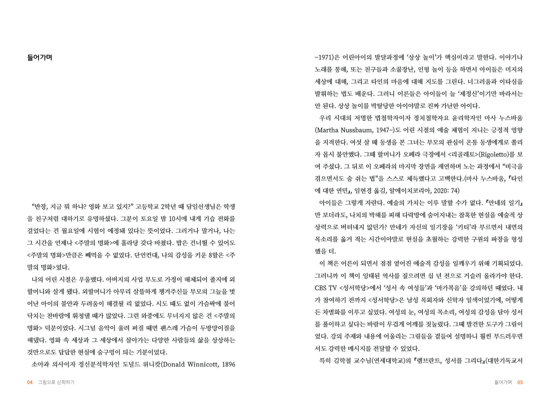 예술 감성에 기대어 기독교 신앙을 더욱 깊이 있게 다듬기 원하는 신자들, 기독교의 반지성주의에 염증이 나서 자칫 하나님까지 밀쳐둔 가나안 신자가 계시면 이 책에서 보물을 찾아보라고 권하고 싶다. 서양종교화를 읽는 안목뿐만 아니라 하나님의 신비로운 뜻까지 덤으로 챙길 수 있을 것이다. 책을 쓰는 내내 위대한 화가들과 연애하며 지냈다. 그러나 이 연애의 끝은 결국 하나님으로 수렴된다. 이 책은 요즘 실험적으로 몰두하고 있는 신학놀이의 연장이다. 함께 신나게 놀이를 즐기시라.